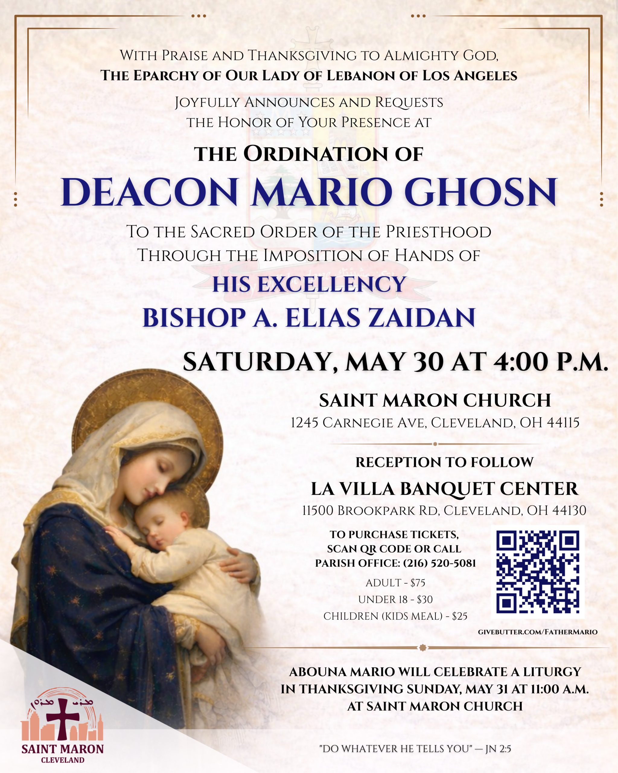 Priestly Ordination of Deacon Mario Ghosn Featured May 30 @ 4:00 pm St. Maron Church Downtown 1245 Carnegie Ave, Cleveland, Ohio